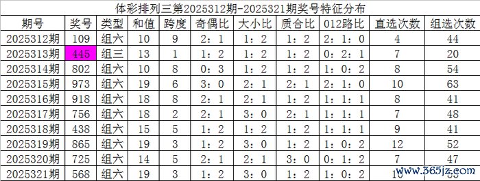 开奖公告:体彩罗列三第2025321期开出奖号:568。组六,有重号:5,奇偶比1:2,大小比3:0,012比1:0:2,和值19,跨度3。